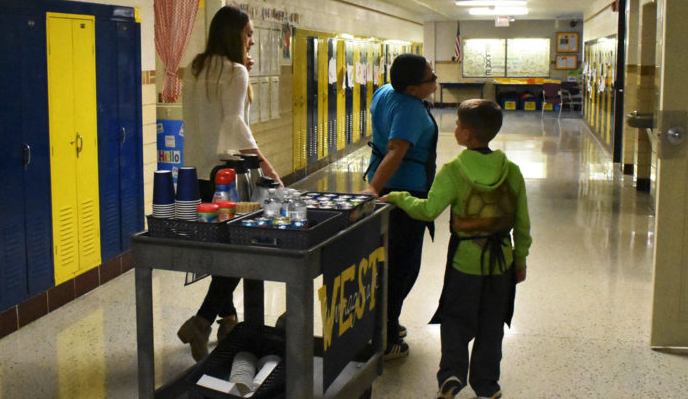 Third-graders Cameron Blouw and Javier Garcia made their way down the hall of West Godwin Elementary last Thursday, pushing a cart stocked with carafes of coffee, hot water for tea, and a variety of cold, fizzy beverages. They stopped outside a classroom, and Javier entered and approached the teacher.